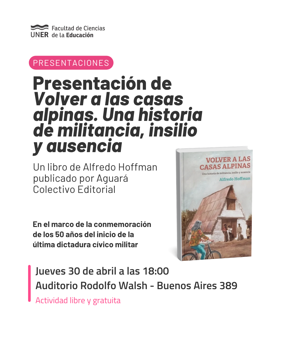 El jueves 30 de abril se presentará en la Facultad de Ciencias de la Educación de la Universidad Nacional de Entre Ríos (UNER) el libro Volver a las casas alpinas. Una historia de militancia, insilio y ausencia, del graduado de la FCEDU Alfredo Hoffman, un relato de no ficción que recupera episodios de la organización política de la juventud durante la década del 70 en Entre Ríos y heridas vigentes del terrorismo de Estado.